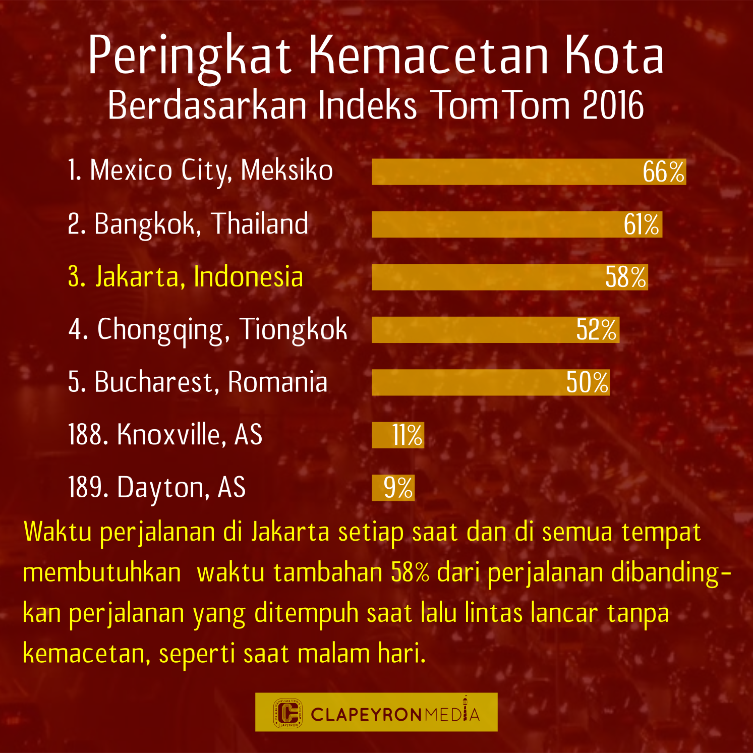 Melalui Indeks Lalu Lintas TomTom, Jakarta mendapat nilai tingkat kemacetan sebesar 58% menempati peringkat ketiga setelah Mexico City dan Bangkok dengan nilai masing-masing 66% dan 61%. Indeks Lalu Lintas TomTom 58% berarti di semua ruas jalan dan semua perjalanan membutuhkan waktu tambahan sebesar 58% dari waktu yang dibutuhkan saat keadaan lalu lintas lancar. Ditinjau dari survei lain, Castrol Magnatec Stop-Start Index, yang menilai kemacetan dari jumlah berhenti dan jalan pada navigasi pengguna TomTom tiap tahun per kilometer, dua kota besar di Indonesia menempati 4 besar kota paling macet sedunia. Dengan nilai indeks 33.240, Jakarta menduduki peringkat pertama disusul Istanbul (32.520), Mexico City (30.840), dan Surabaya (29.880).