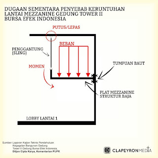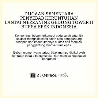 Senin (15/1), Selasar Mezzanine di Lobby Tower II Bursa Efek Indonesia (BEI) mengalami kegagalan bangunan. Keruntuhan diduga akibat konsentrasi beban saat adanya rombongan mahasiswa pada selasar yang berbentuk kantilever tersebut.